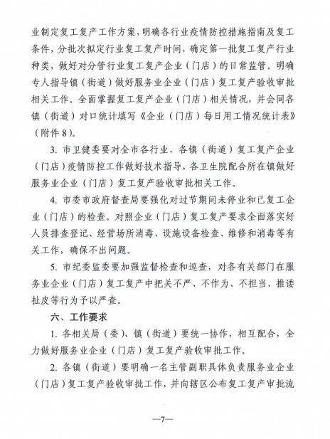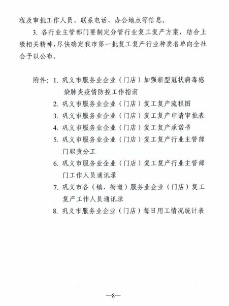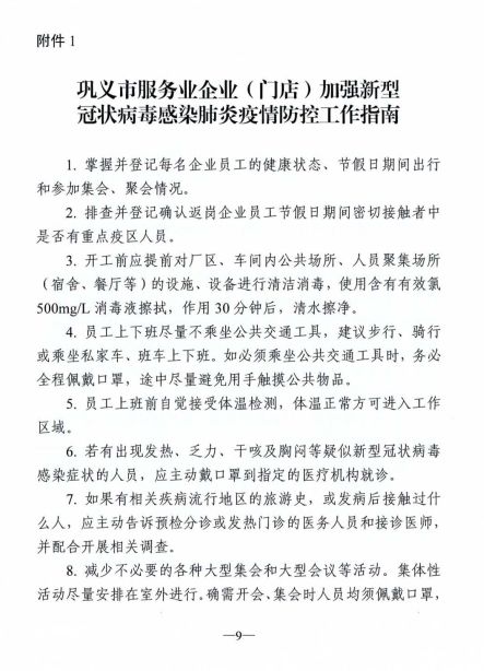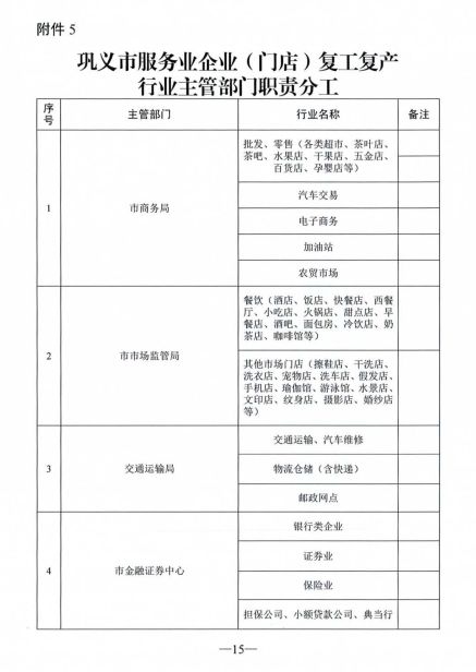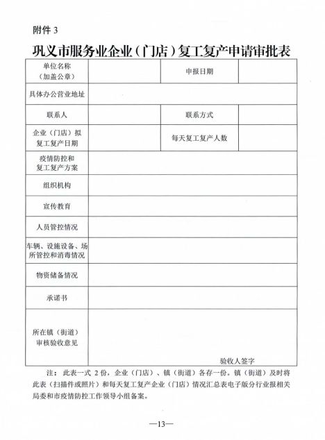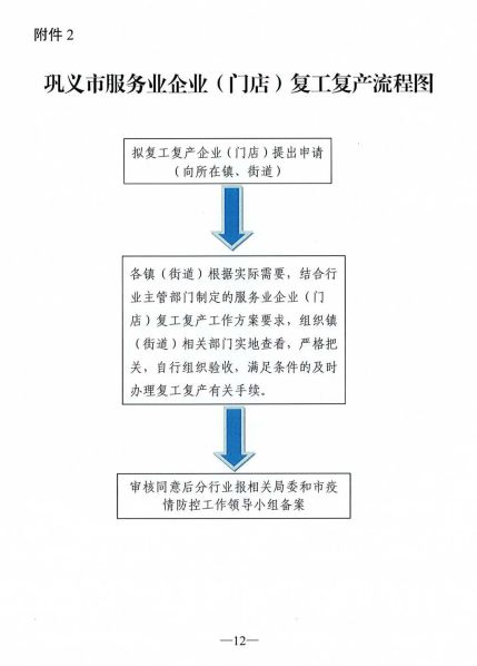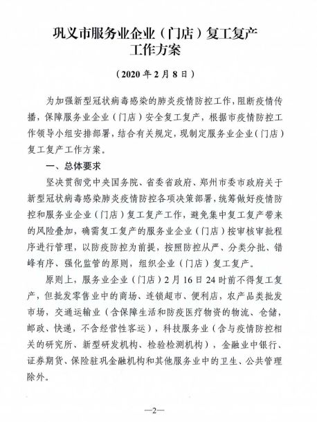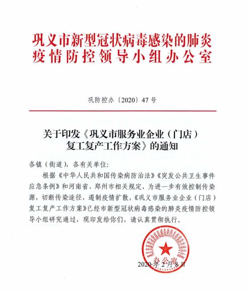 为保障服务业企业(门店)复工复产,巩义市防控办印发《巩义市服务业企业(门店)复工复产工作方案》(巩防控办〔2020〕47号),明确要求,原则上,服务业企业(门店)2月16日24时前不得复工复产。拟复工复产的服务业企业(门店),需提出申请经审核验收同意、备案后,方可复工复产。