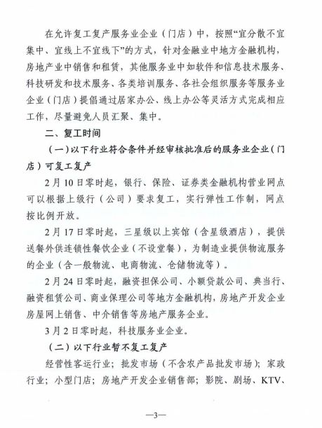 2月17日零时起,三星级以上宾馆(含星级酒店),提供送餐外供连锁性餐饮企业(不设堂餐),为制造业提供物流服务的企业(含一般物流、电商物流、仓储物流等)。