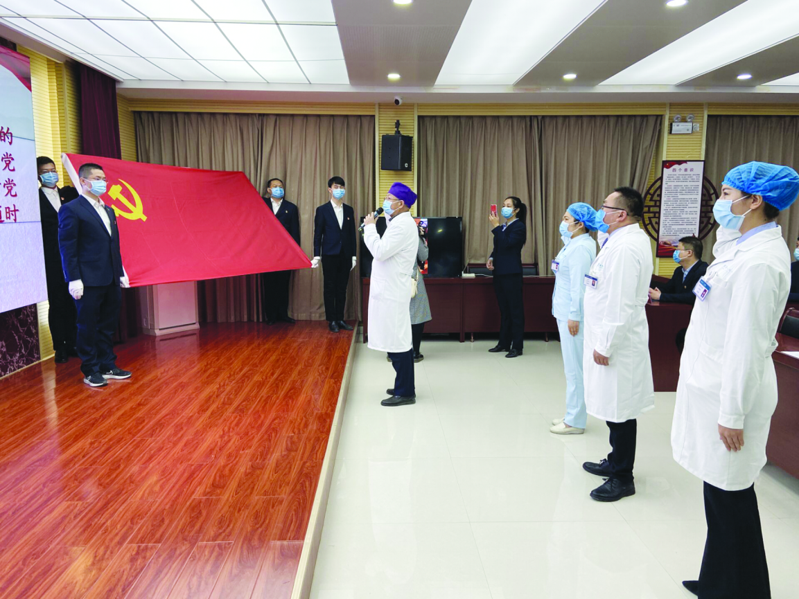口罩遮住了他们的面容,却挡不住他们坚定的眼神。在市人民医院感染性疾病科主任周成国的带领下,4名医护人员面对鲜红的党旗,高举右拳,庄严宣誓,一声声铿锵有力的誓言久久回荡。随后,为新党员佩戴党员徽章并赠送《中国共产党章程》。