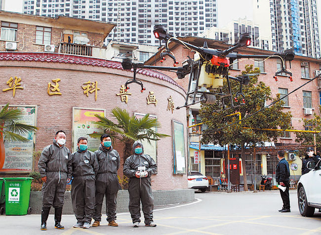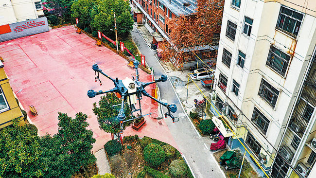 2月17日,在平顶山市新华区西市场办事处团结路社区,工作人员正在操作携带16公斤消毒液的无人机,对小区进行消杀作业。(记者 聂冬晗 摄)