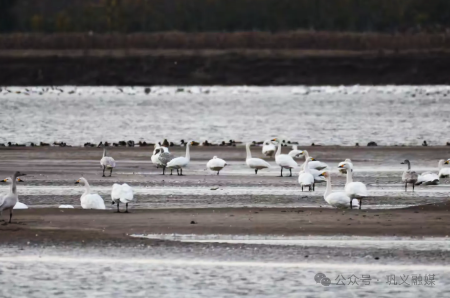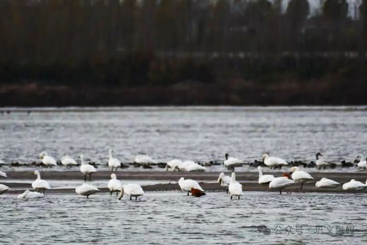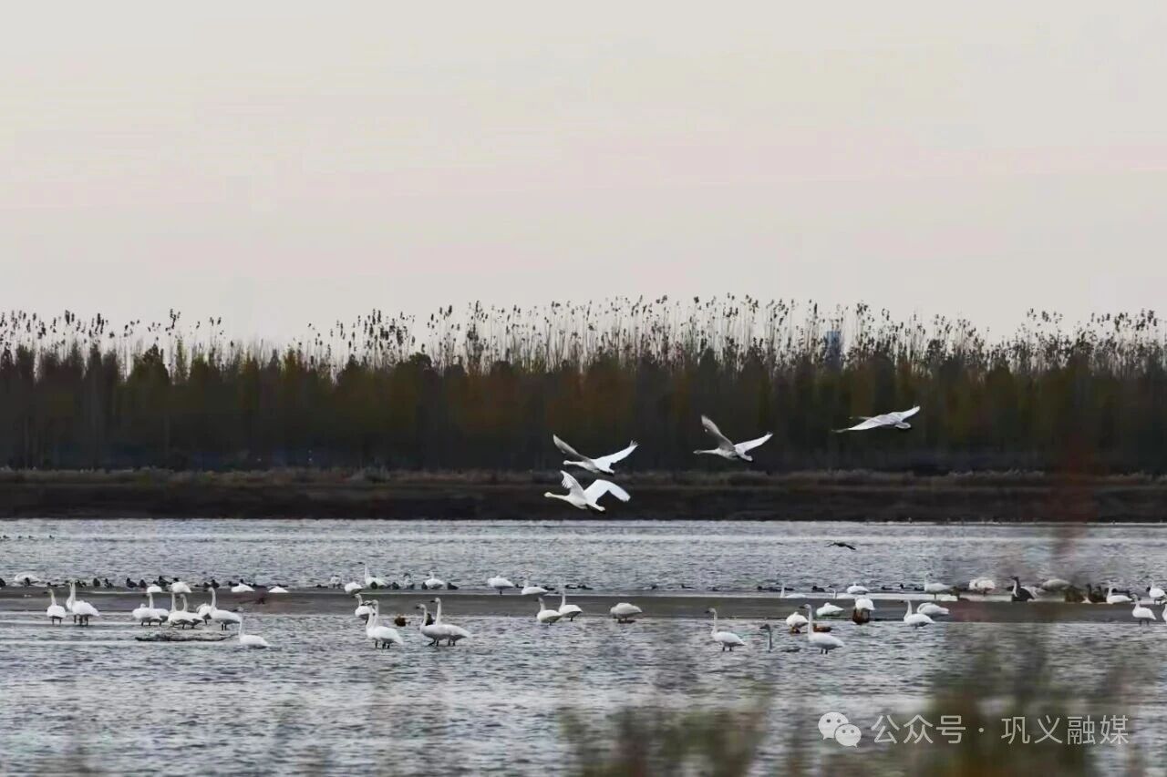 巩义市黄河湿地自然保护区气候适宜、水源丰茂,是我国水鸟越冬的重要栖息地之一。在这里,成群结队的小天鹅在水面或滩涂上嬉戏、觅食,时而一飞冲天,在天空翱翔,场面甚是壮观,给冬日里的巩义黄河湿地增添了无限生机。