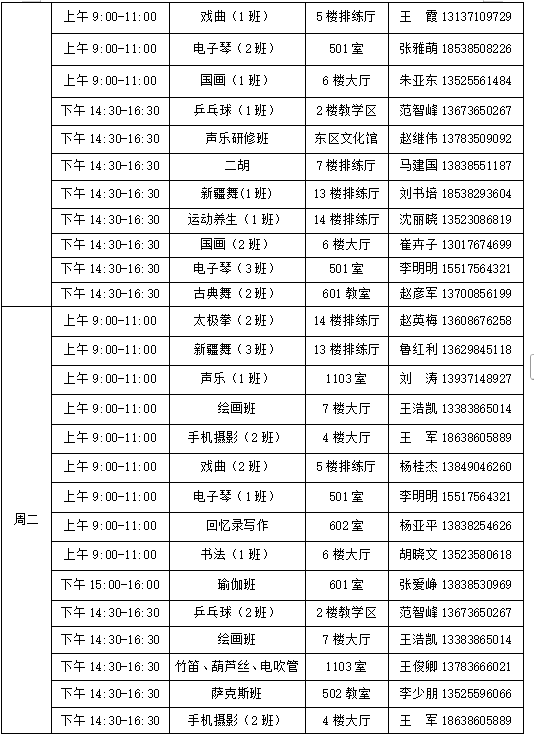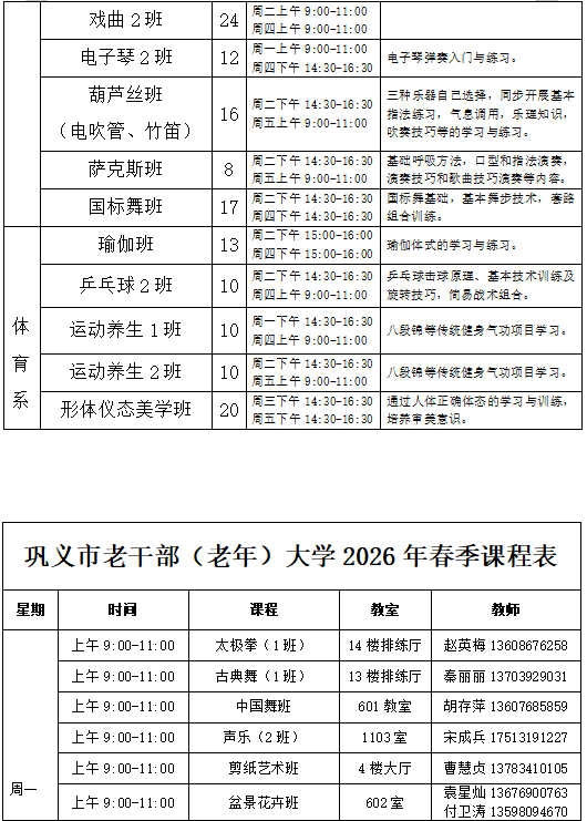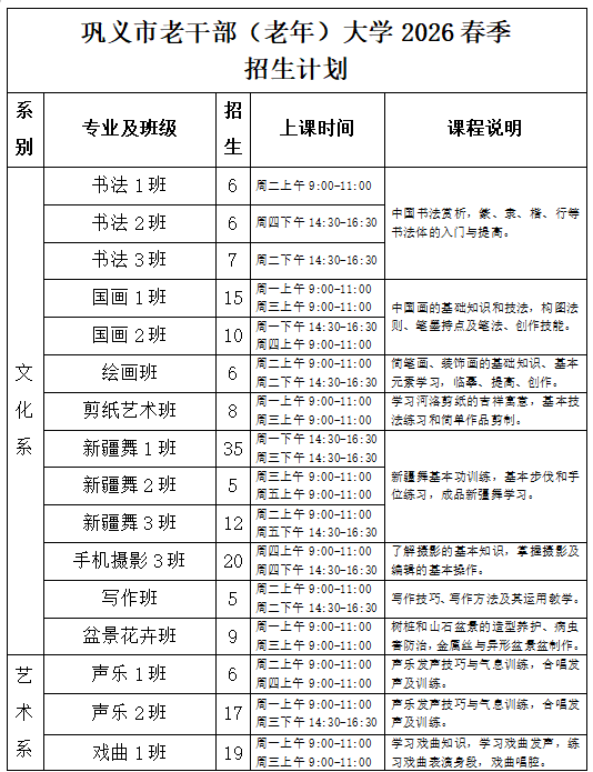 2026年春季班学校开设书法、国画、绘画、剪纸、盆景花卉、声乐、戏曲、葫芦丝(竹笛、电吹管)、二胡、电子琴、萨克斯、国标舞、新疆舞、古典舞、中国舞、太极拳、运动养生、乒乓球、瑜伽、形体仪态美学班、文学写作、手机摄影编辑等共计22个专业班。上课时间为周一至周五(国家法定节假日除外),每次课时为100-120分钟。春季班根据在校生实际情况,招生以补充招生为主,在报名时间内招满即止(详见招生计划)。
